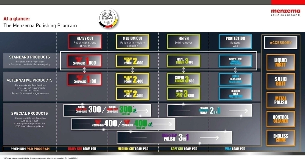 Permite realizar el proceso completo de pulido, abrillantado y sellado sin necesidad de cambiar de producto, únicamente variando las boinas de aplicación de más agresiva a más suave, comenzando con la boina amarilla de dureza media, a continuación con la suave de color verde y finalizando con la azul de encerado.